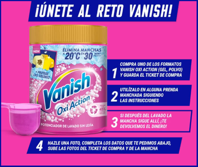 Participa en el reto Vanish, prueba el producto y si no te convence, podrás solicitar el reembolso de uno de los productos promocionados.