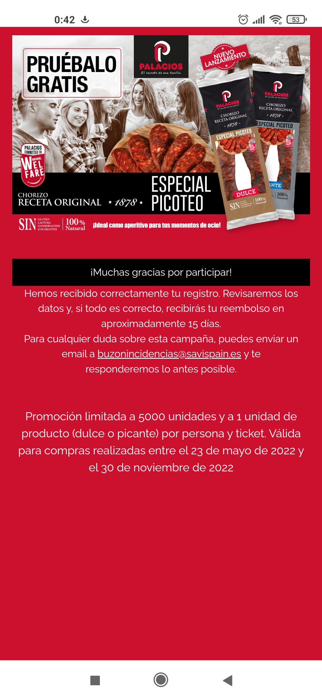 Regalo: | 5.000 reembolsos de los chorizos Palacios promocionados |