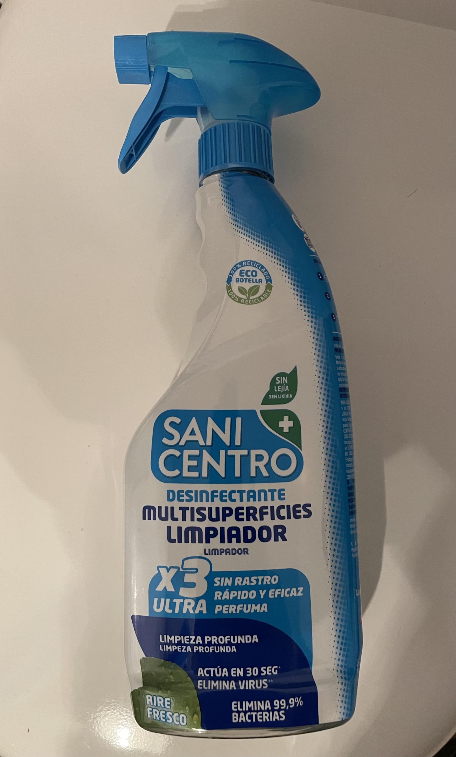 O Sanicentro Multisuperficies Desinfectante sin Lejía 750 ml (con código de barras: 8410931013208).