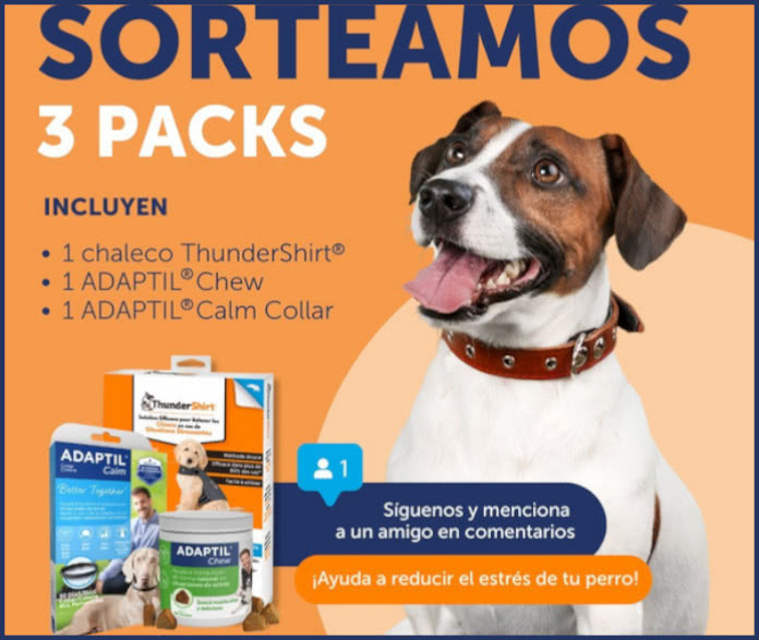 Adaptil está sorteando un pack para perro que incluye un chaleco ThunderShirt, snacks, y un Calm Collar, diseñados para ayudar a tu perro a sentirse más tranquilo.