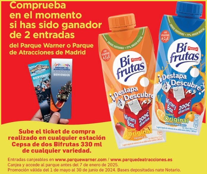 Compra uno de los productos promocionados de Bifrutas y accede al sorteo de 100 entradas dobles para entrar al Parque Warner o al Parque de Atracciones de Madrid.