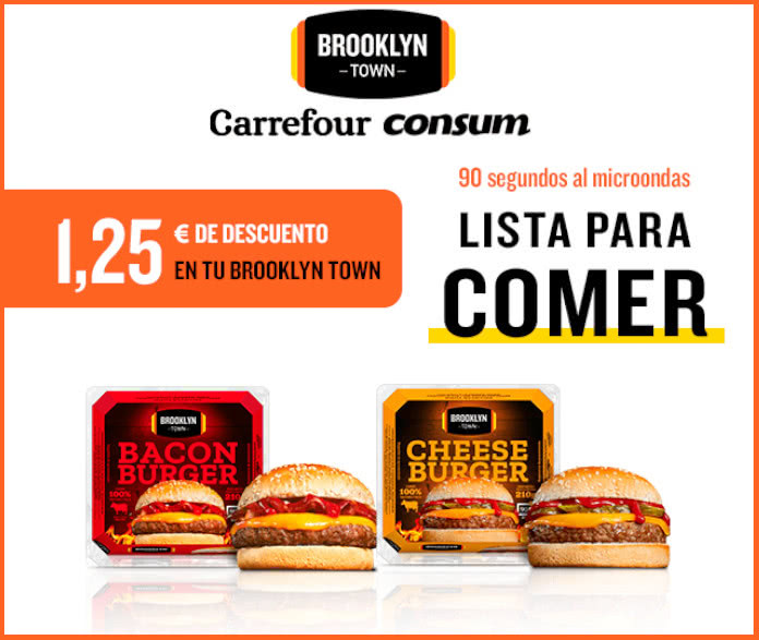 Brooklyn Town está regalando 100.000 cupones de 1,25€ para disfrutar de la Bacon o Cheese Burger, canjeables en supermercados Consum o Carrefour.