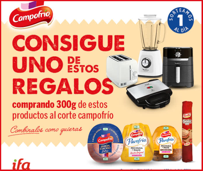 Compra en establecimientos IFA 300g de productos seleccionados de Campofrío y podrás ganar estos premios: 16 sandwicheras, 15 freidoras de aire, 15 batidoras, y más.
