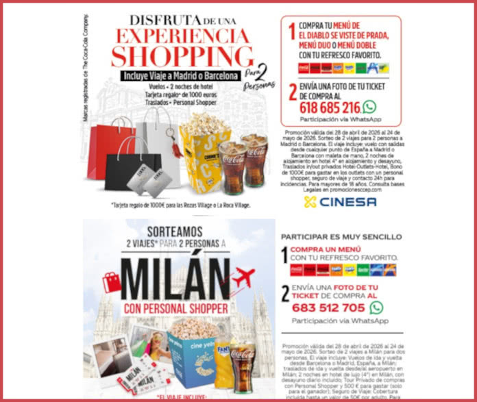 Coca-Cola lanza dos sorteos en los cines Yelmo y Cinesa en los que podrás ganar uno de los dos viajes a Milán, Madrid o Barcelona para experiencia shopping.