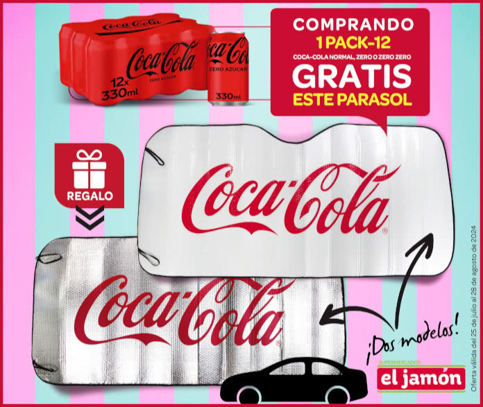 Realiza una compra de un pack de Coca-Cola en un supermercado El Jamón y llévate de regalo un parasol.