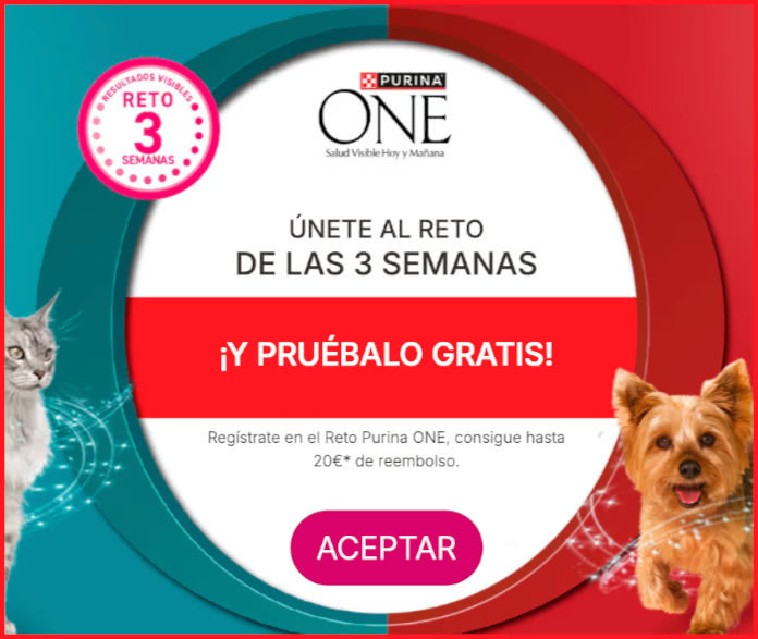 Únete al reto de 3 semanas de Purina ONE para poder conseguir un reembolso de hasta 20 €.