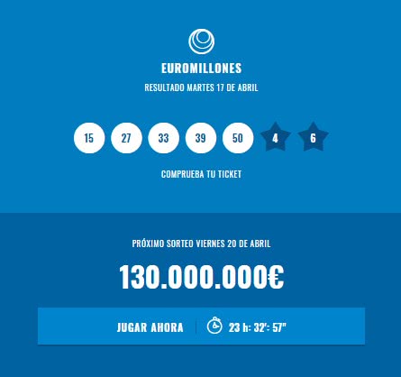 Hoy hay un bote de 130 millones en el sorteo del Euromillón. Y en la reputada web de loterias online Ventura24 te regalan una participación gratis. Pagas una y tienes otra de regalo para aumentar tus posibilidades de llevarte el bote multimillonario.
