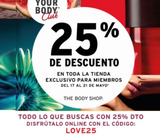 Del 17 al 21 de Mayo, THE BODY SHOP tiene una ventaja genial ¡¡Te rebaja el 25% en tus compras!! ¿Quieres aprovechar la oferta? Pues será cuestión de validar un código promocional.