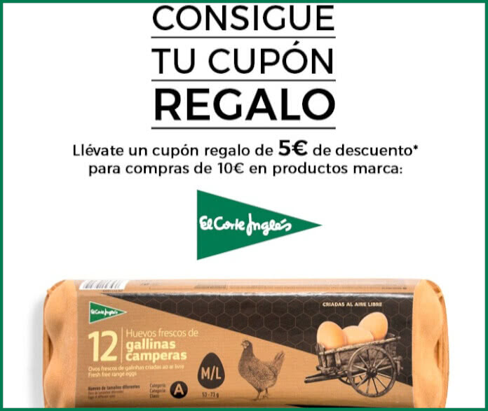 Puedes conseguir un cupón de 5€ para tu próxima compra mínima de 10€ en huevos camperos de la marca El Corte Inglés.