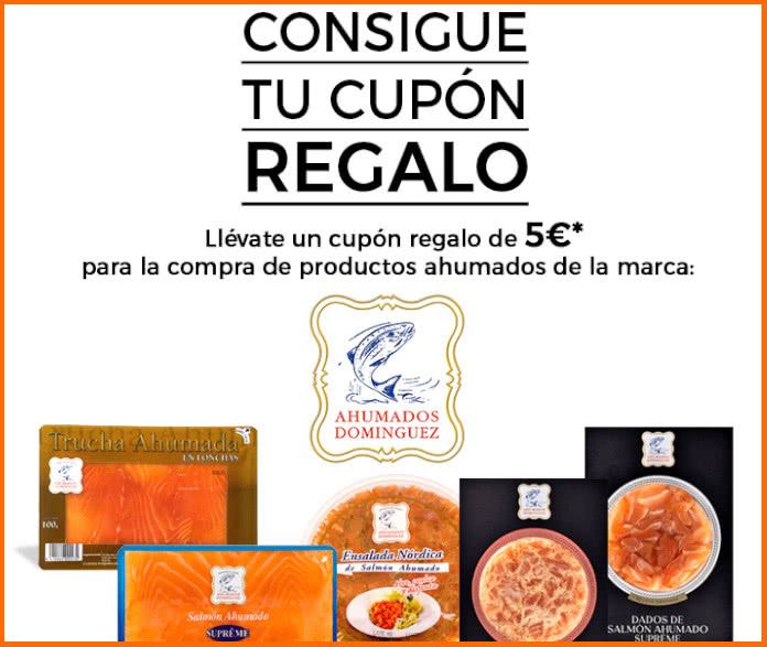 En esta promoción podrás obtener un cupón de 5€ para usar en tu siguiente compra de productos Ahumados Domínguez.