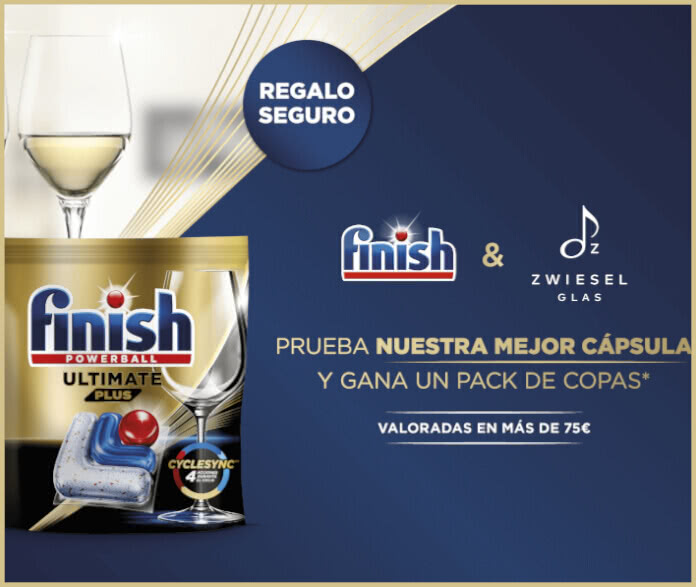 Al comprar productos Finish en promoción, puedes conseguir un regalo regulo: un pack de copas de vino o champagne. Hay 650 premios.
