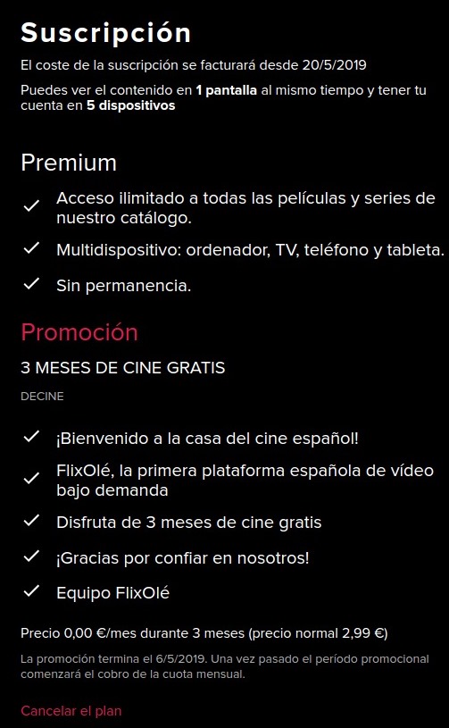 13-02-2019 de 2:48 pm (hace 7 años)Pues yo lo acabo de probar y me ha dejado sin problema. Leí en otra web de chollos que con DECINEESPANOL1 también te dejaba hacerlo.