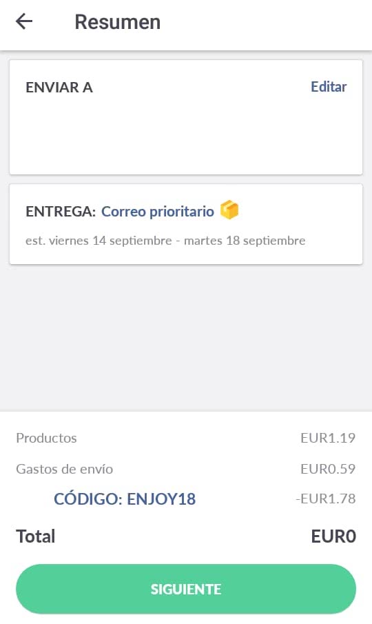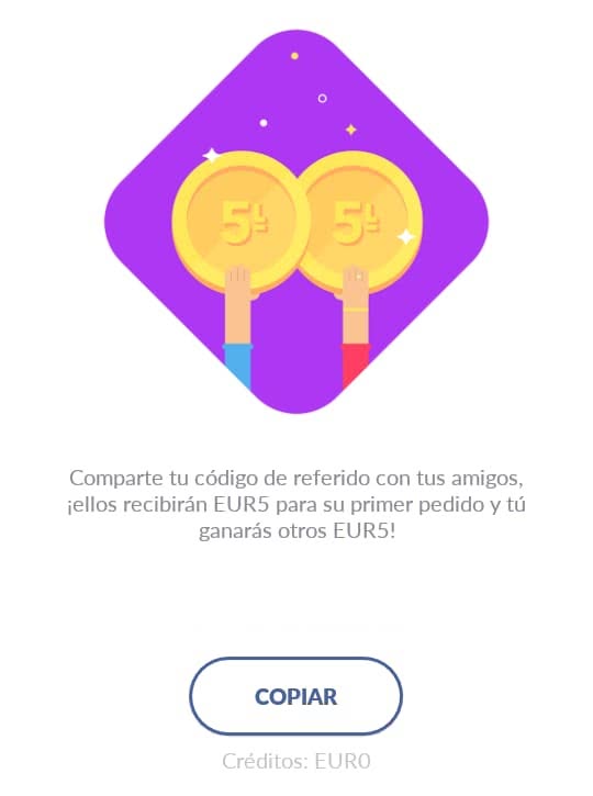 - Al final te dan un código promocional para compartir y los que usen ese código para realizar un pedido recibirán un descuento de 5 euros (tú también obtendrás 5 euros de descuento)