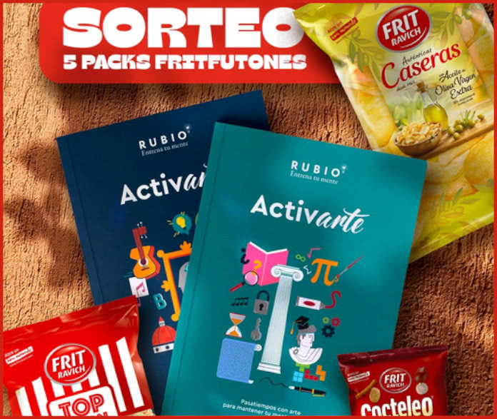 El pack incluye: 2 libros de pasatiempos Rubio + un lote de productos Frit Ravich.