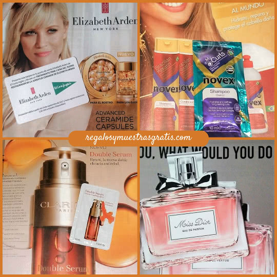 Y además, en su interior encontraréis estupendas muestras gratis como las de la imagen: una tarjeta regalo exclusivo para presentar en centros El Corte Inglés y llevaros gratis 3 cápsulas del suero restaurador de juventud Ceramide de Elizabeth Arden, un sachet de Champú de la marca brasileña Novex a base de queratina, un sachet del nuevo sérum antiedad Double Serum de Clarins y una tarjetita del perfume Miss Dior.