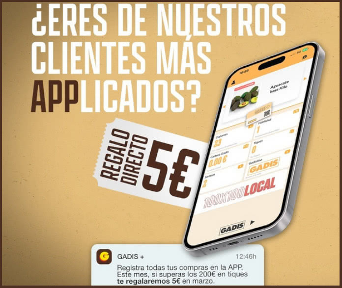 Acumula tus compras del mes de febrero en la app de Gadis, si juntas más de 200€, obtendrás un vale de 5€ para usar en marzo.