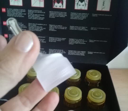 Las aplicáis con el puntero directamente en el cuero cabelludo y luego con las palmas de las manos hacéis presión y movéis las manos contra el cuero cabelludo para ayudar a que se absorba y penetre.