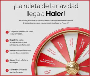 Gira la ruleta navideña de Haier para poder ganar premios como entradas de cine, experiencias Rukalka, freidora de aire, iPhone Air y 17, y mucho más. Leer más…