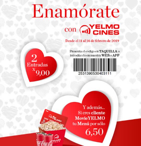 Yelmo Cines lo ha anunciado en varios lugares, se trata de su promoción de San Valentín para que tengas un hermoso Día de los Enamorados. Nada puede faltar a ese día, tampoco una buena peli de las que están en taquilla en Yelmo.