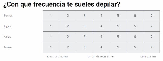 - Responde el cuestionario que te aparece sobre tus costumbres a la hora de depilarte, métodos, frecuencia, etc.