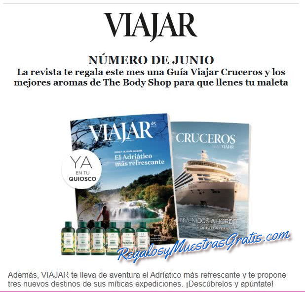29-05-2023 de 8:49 pm (hace 2 años)Por si es de interés…Me ha llegado correo de la revista Viajar con el regalo para el mes de junio (ver imagen) 🙂