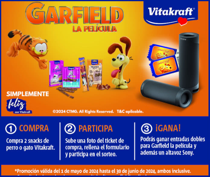 Compra snacks para gato o pero Vitakraft para entrar al sorteo de entradas dobles para asistir al cine y ver la nueva película de Garfield y un altavoz Sony.